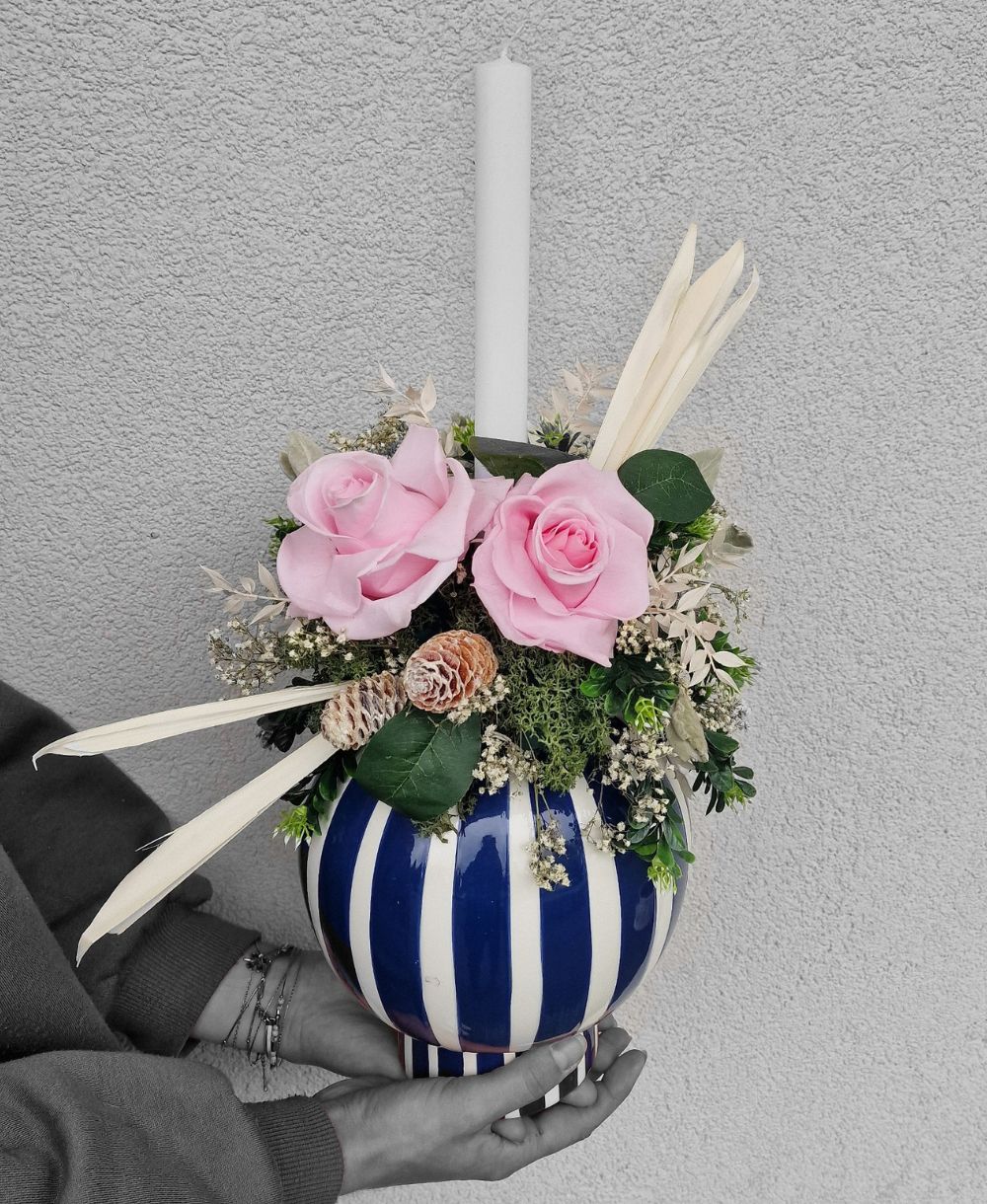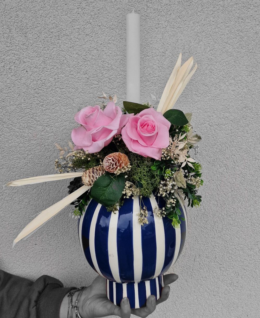 Bring vibrancy and elegance to your home with this bouquet of preserved and dried flowers, adorned with yellow lemons and delicate pink roses. An original, long-lasting and maintenance-free arrangement, delivered with a modern blue and white striped vase. Ideal for chic décor, a sophisticated gift or a touch of freshness all year round!