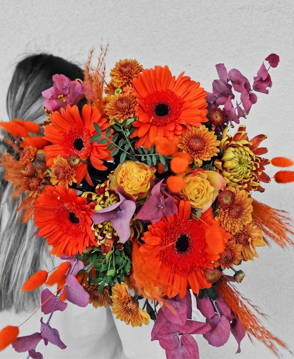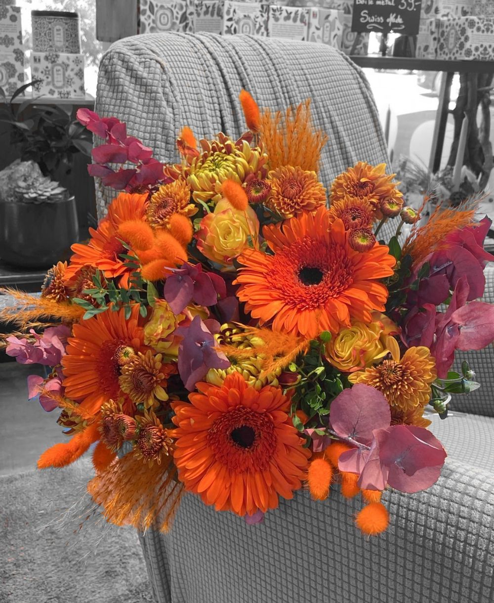 La composition réunit de magnifiques roses orangées, des gerberas éclatants, des chrysanthèmes colorés, de l’eucalyptus parfumé et du lagurus délicat, également appelé « queue de lièvre ». L’ensemble crée un jeu subtil entre rondeur, fraîcheur et légèreté, pour un rendu à la fois moderne et raffiné.