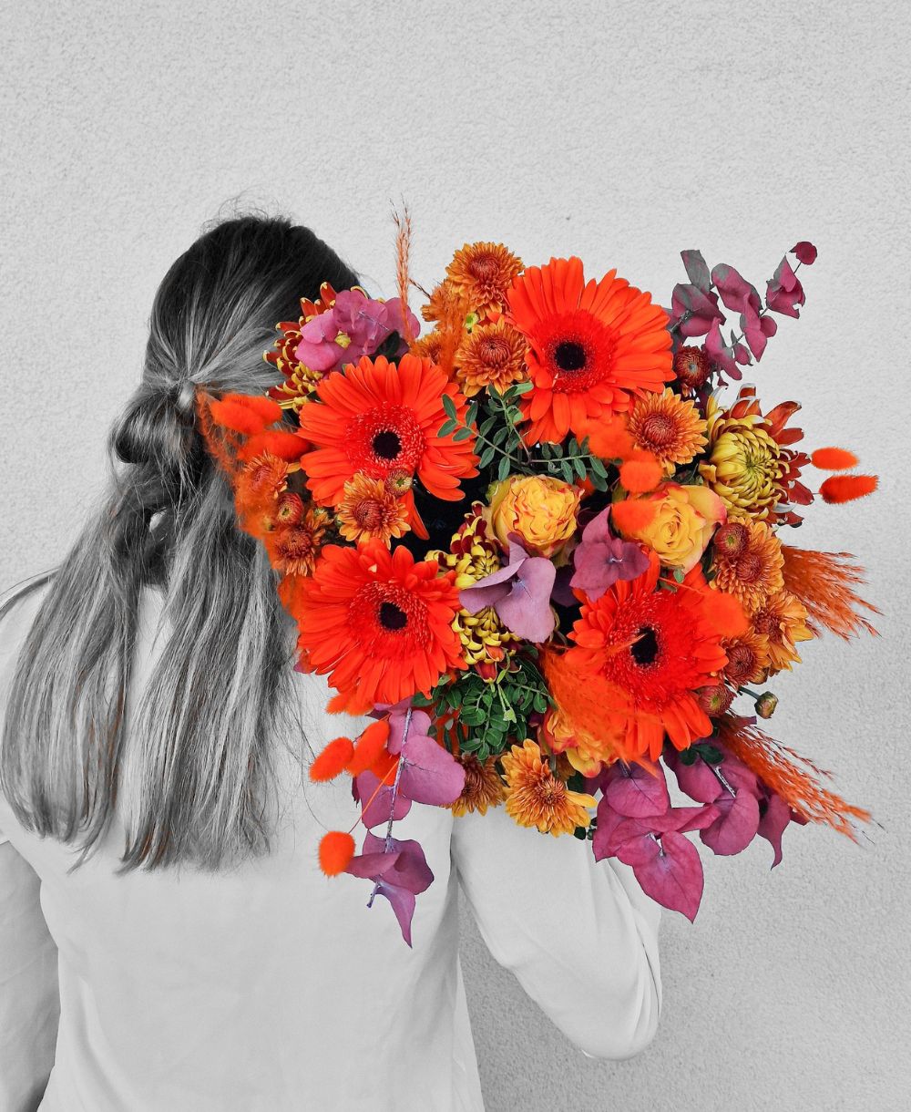 Les tons chauds et solaires de l’orange s’accordent avec les nuances vertes de l’eucalyptus et la douceur des lagurus, donnant au bouquet un caractère unique. Antone s’adapte aussi bien comme cadeau floral que comme décoration de table ou encore comme touche de couleur dans un salon ou une entrée.