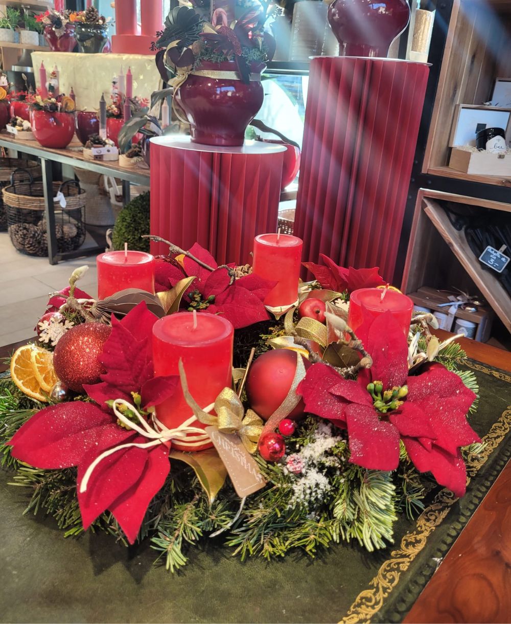 Couronne artisanale en sapin frais (Ø 40 cm), décorée de tons rouges, de tranches d’orange séchée et de boules de Noël. Une pièce chaleureuse et festive pour illuminer votre décoration de l’Avent.