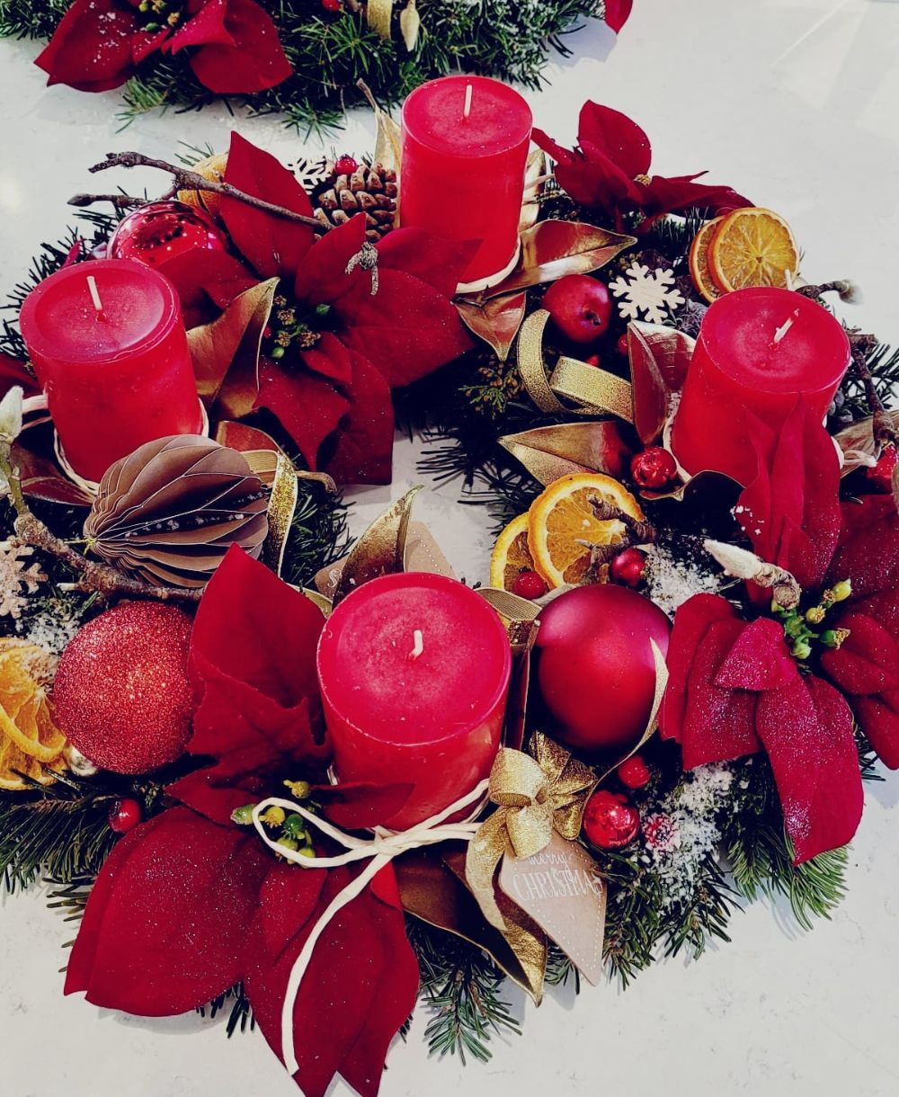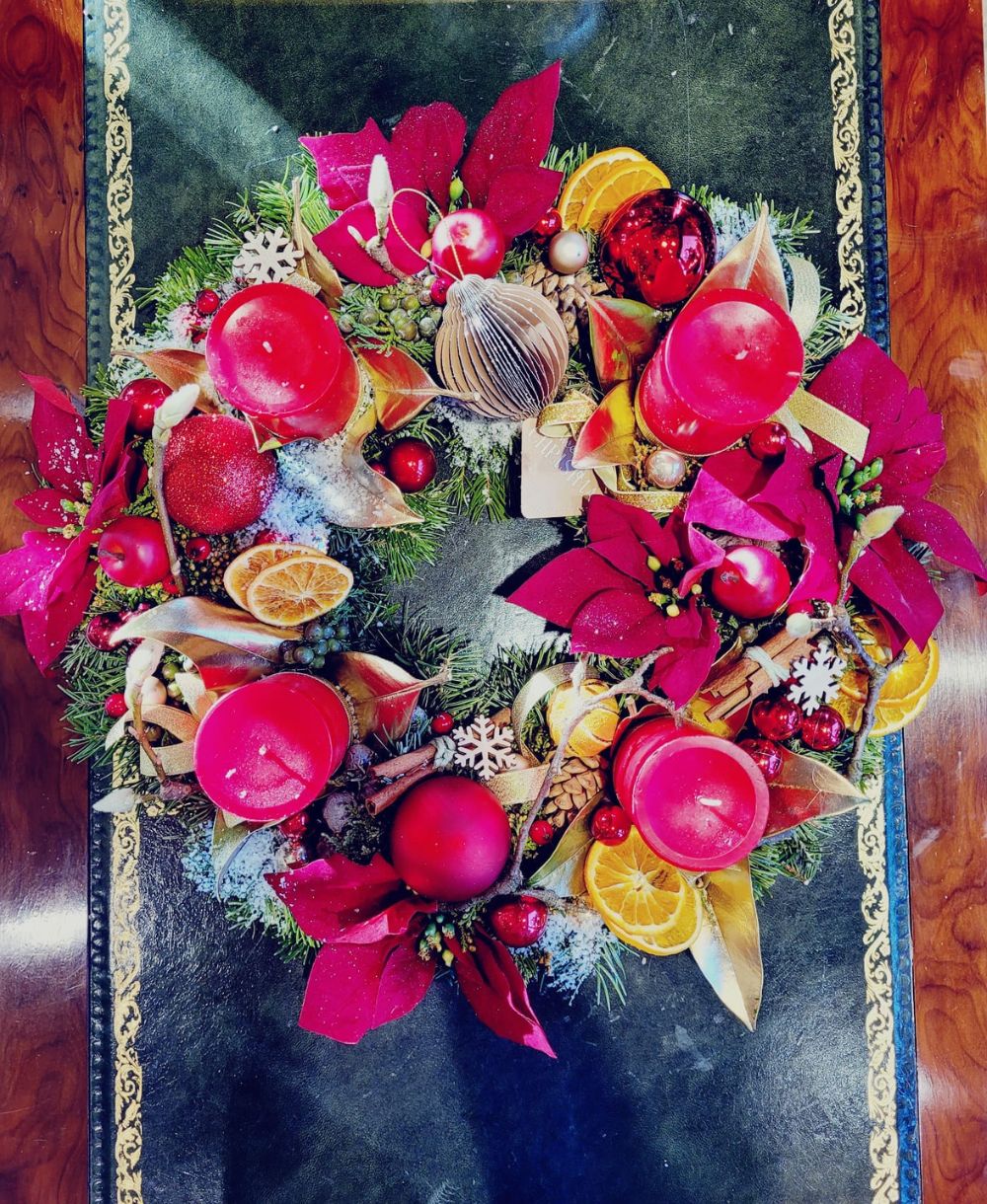 Des tranches d’orange séchées, délicatement intégrées, ajoutent une touche authentique et gourmande, tandis que des boules de Noël rouges et dorées subliment l’ensemble en apportant éclat et élégance. Chaque couronne est réalisée à la main avec des matériaux naturels soigneusement sélectionnés, garantissant un objet décoratif unique et durable.