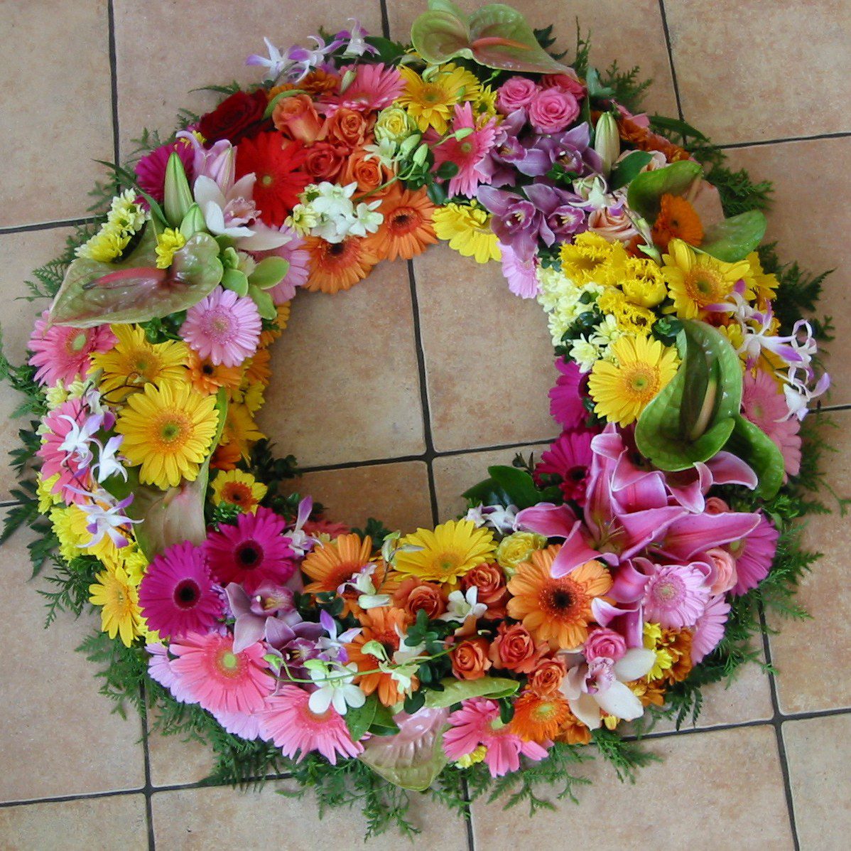 Cette couronne mélangée, confectionnée avec de nombreuses fleurs piquées touche-touche, est conçue pour être disposée à terre à côté du cercueil. Disponible en trois tailles :