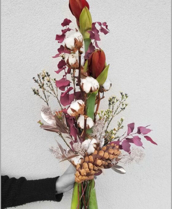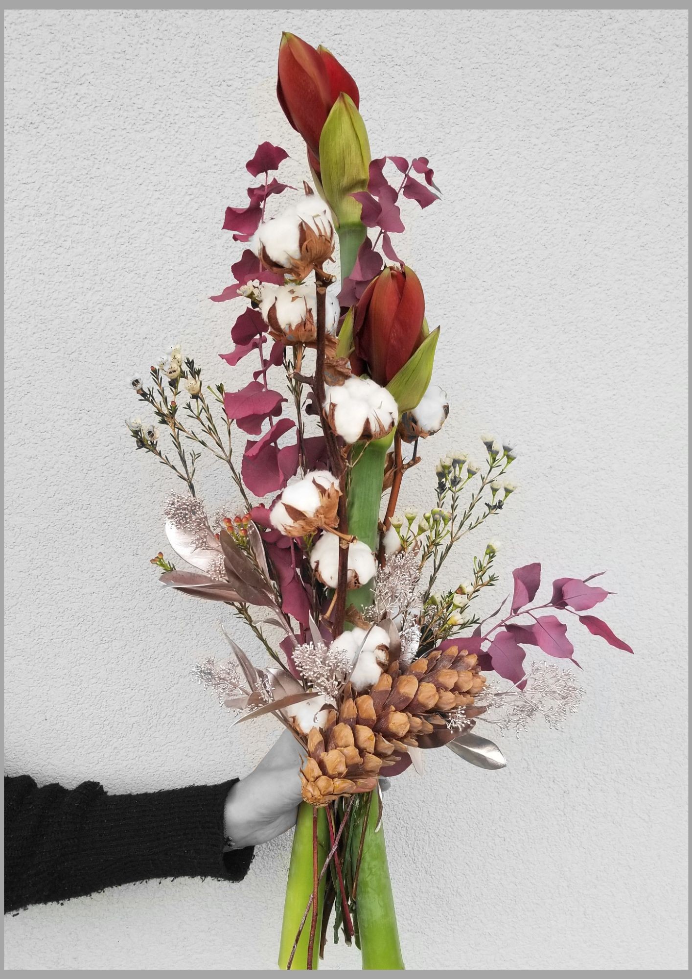 Le bouquet Nicolas réunit des branches de coton, un amaryllis rouge, des pives, de la skimmia, des fleurs de cire et de l’eucalyptus. Une composition hivernale naturelle et chaleureuse, idéale pour les fêtes ou pour apporter une touche cosy à votre intérieur.