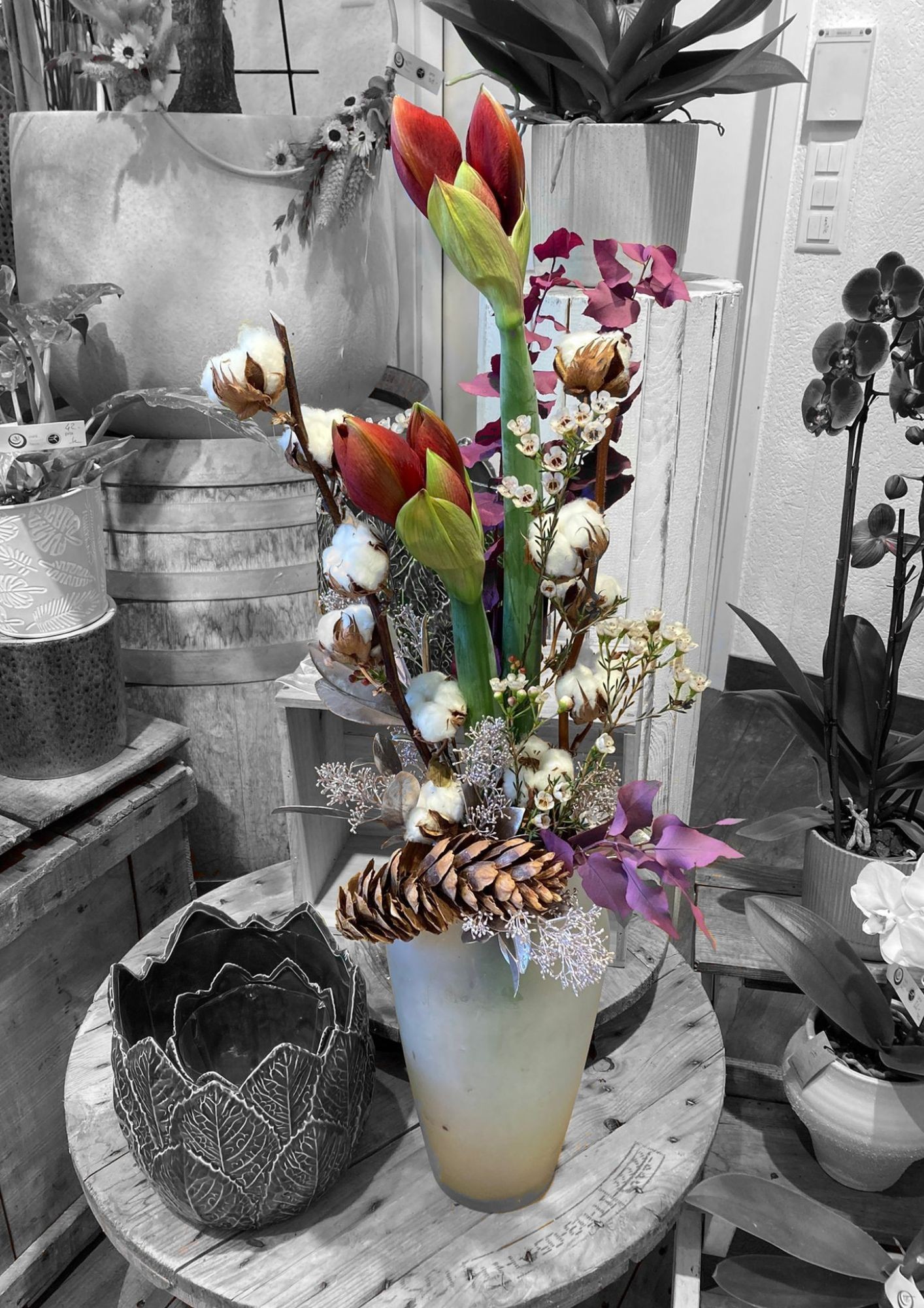Le bouquet Nicolas est une création florale chaleureuse et authentique, pensée pour célébrer l’esprit de l’hiver et des fêtes de fin d’année. Il associe des branches de coton d’une blancheur douce et réconfortante à la splendeur de l’amaryllis rouge, fleur majestueuse par excellence, symbole de passion et de festivité.